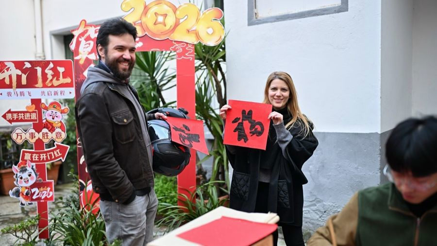 新春佳节,中国文化中心开启了福袋赠送活动,师生全员出动,为每一位来体验的游客送上满载马年祝福的福袋。书法老师姜雪的摊位颇为热闹,她免费为外国友人写名字。安德烈小心翼翼地将写有自己名字的书法作品揣进口袋,还饶有兴致地拿起毛笔临摹了一遍,原来他曾在中国学过书法,引来大家一片赞誉。