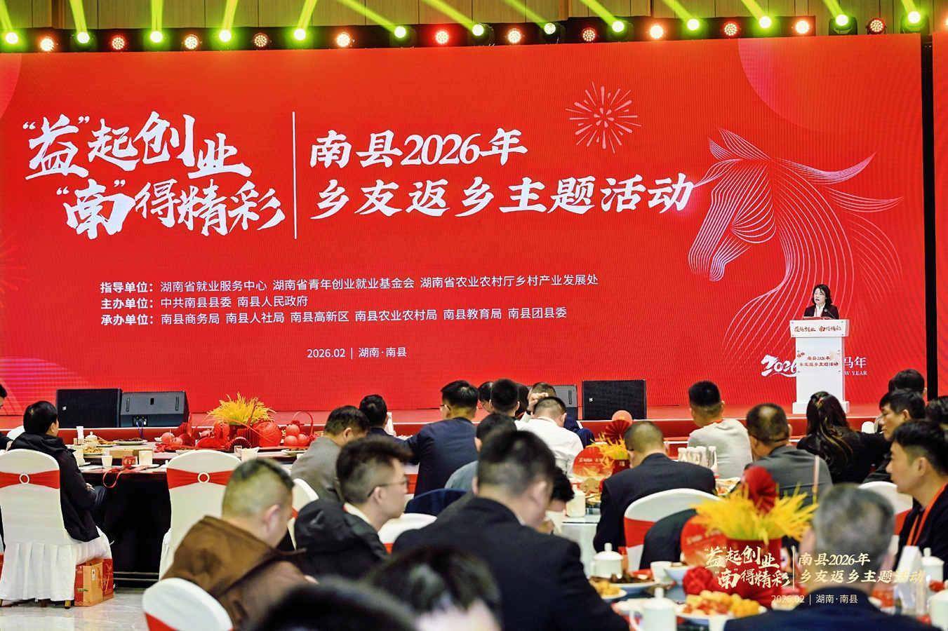 活动现场。单位供图2月15日,“‘益’起创业、‘南’得精彩”南县2026年乡友返乡主题活动举办。来自全国各地的两百余名杰出乡友、企业家代表、专家学者与本地创业者齐聚一堂,共听乡音、共叙乡情,共绘家乡高质量发展宏伟蓝图。